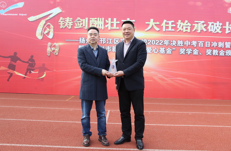 上午7点50分,邗江区实验学校举行“新能源教育爱心基金”发放仪式,该校九年级学生齐聚青春广场,参加2022年“决胜中考,百日冲刺”誓师大会暨教育爱心基金颁发活动。邗江区实验学校校长杜成智为活动开鼓,校领导宣读表彰决定,奖学金、奖教金获奖代表登台领奖,邗江区实验学校向江苏新能源置业集团董事长包广林、总裁王秋云赠送“心系教育 爱满邗实”水晶纪念牌,感谢“新能源”多年来关爱教育送来春风,学生代表、教师代表一一发言,立志中考出彩,交出优秀答卷。在热烈的气氛中,九年级学生宣誓:“九年磨砺,志凌绝顶。邗实学子,冲锋在前。决胜中考,笑迎凯旋。为我邗实,再续佳篇。”